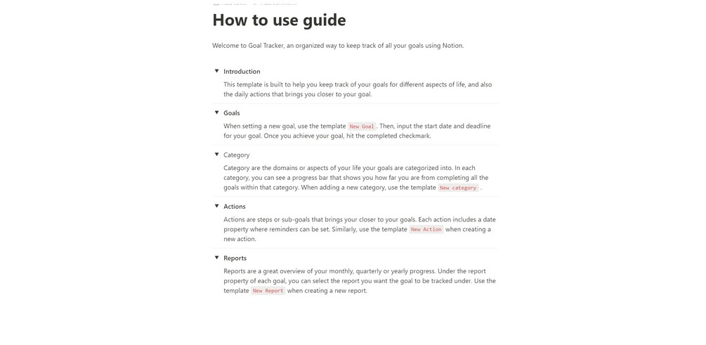 ✅ → Reports are a great overview of your monthly, quarterly or yearly progress. Under the report property of each goal, you can select the report you want the goal to be tracked under. Use the template New Report when creating a 【new report】.