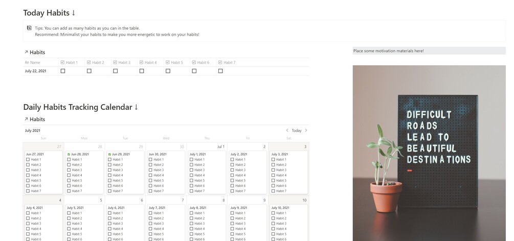 ✅ → Habit tips A column dedicated to motivating yourself to complete your habits each time you open the page.
